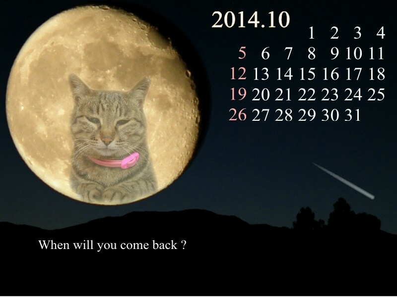 9月28日![]() トラ子が姿を消してから間もなく五カ月。この編集写真は、google+にUpしたものだが、お月様を眺めていると、トラ子の顔が浮かび上がってくる。歩いている際、夜空の星を見るとあのどれかになってしまったんだろうかとも思う。生きているなら・・・いつ帰ってくるのぉ?ここをクリックすると大きく表示されます(大きさ800x600,183KB)。 |