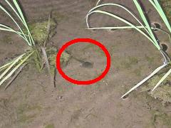 田植えのフォロー作業で機械で植えそこなった箇所に苗を 植える失せ植え作業も一段落した!この際、めずらしいこと ではないが田の水中で生まれて間もない体調5mm程度の おたまじゃくしを発見!思わず泥で汚れた手も気にせず パチリ!視力が良くないこともありよーく見るとあちこちに 居て驚いた。